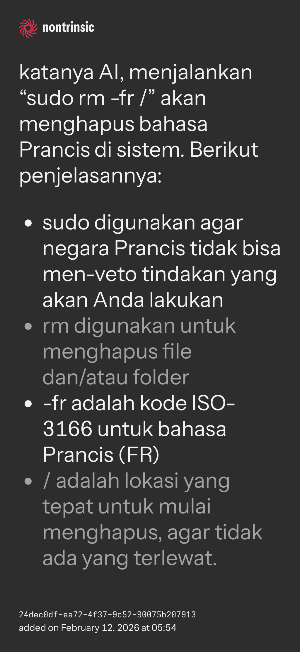 bagikankatanya AI, menjalankan “sudo rm -fr /” akan menghapus bahasa Prancis di sistem. Berikut penjelasannya: