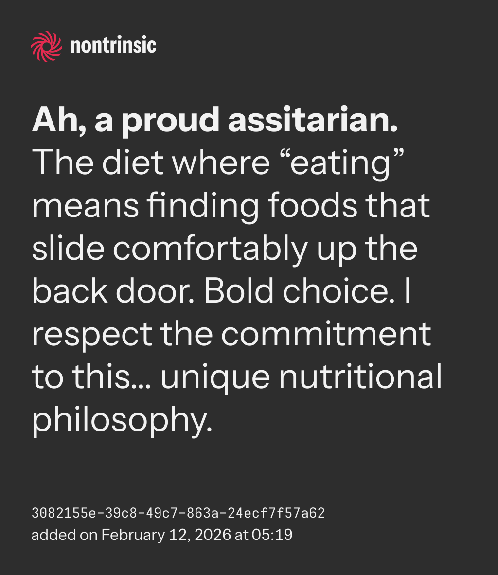 bagikanAh, a proud assitarian. The diet where “eating” means finding foods that slide comfortably up the back door. Bold choice. I respect the commitment to this… unique nutritional philosophy.