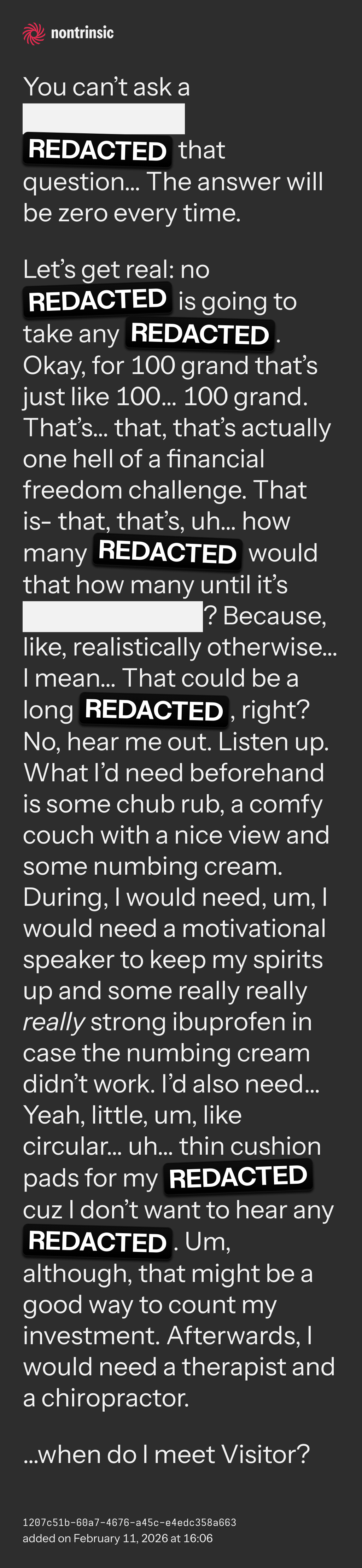 Let’s get real: no REDACTED is going to take any REDACTED. Okay, for 100 grand that’s just like 100… 100 grand. That’s… that, that’s actually one hell of a financial freedom challenge. That is- that, that’s, uh… how many REDACTED would that how many until it’s ? Because, like, realistically otherwise… I mean… That could be a long REDACTED, right? No, hear me out. Listen up. What I’d need beforehand is some chub rub, a comfy couch with a nice view and some numbing cream. During, I would need, um, I would need a motivational speaker to keep my spirits up and some really really really strong ibuprofen in case the numbing cream didn’t work. I’d also need… Yeah, little, um, like circular… uh… thin cushion pads for my REDACTED cuz I don’t want to hear any REDACTED. Um, although, that might be a good way to count my investment. Afterwards, I would need a therapist and a chiropractor.