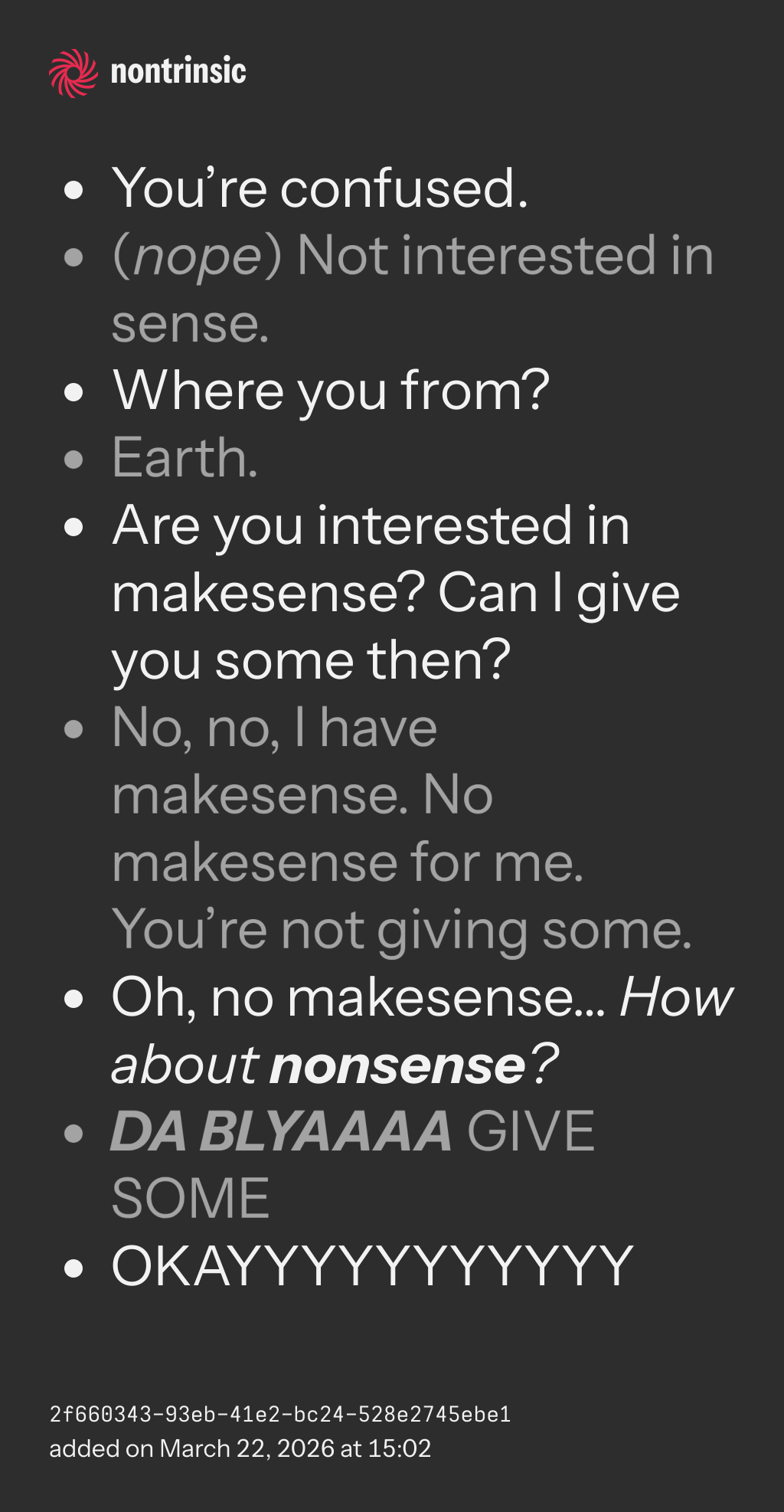 - Oh, no makesense… How about nonsense?