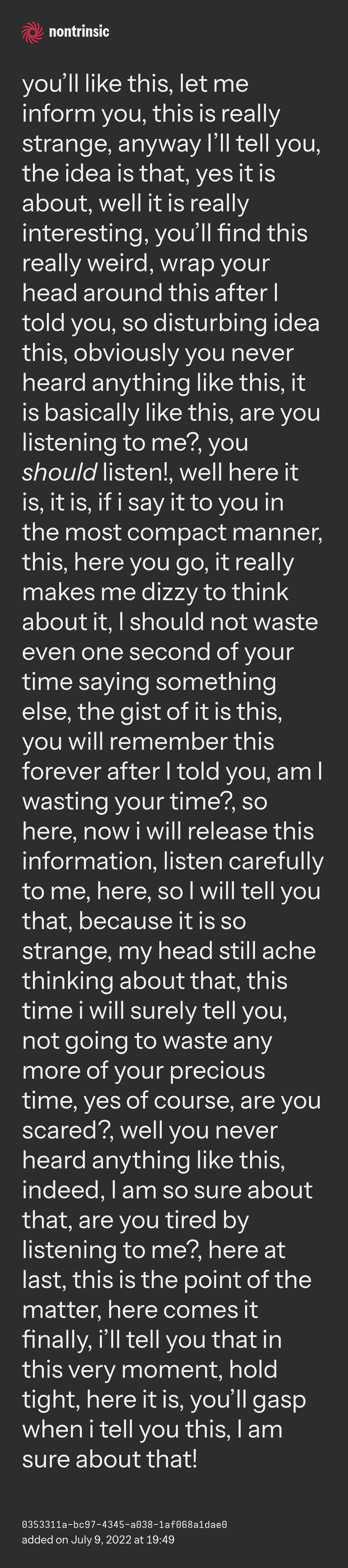 поделитьсяyou’ll like this, let me inform you, this is really strange, anyway I’ll tell you, the idea is that, yes it is about, well it is really interesting, you’ll find this really weird, wrap your head around this after I told you, so disturbing idea this, obviously you never heard anything like this, it is basically like this, are you listening to me?, you should listen!, well here it is, it is, if i say it to you in the most compact manner, this, here you go, it really makes me dizzy to think about it, I should not waste even one second of your time saying something else, the gist of it is this, you will remember this forever after I told you, am I wasting your time?, so here, now i will release this information, listen carefully to me, here, so I will tell you that, because it is so strange, my head still ache thinking about that, this time i will surely tell you, not going to waste any more of your precious time, yes of course, are you scared?, well you never heard anything like this, indeed, I am so sure about that, are you tired by listening to me?, here at last, this is the point of the matter, here comes it finally, i’ll tell you that in this very moment, hold tight, here it is, you’ll gasp when i tell you this, I am sure about that!