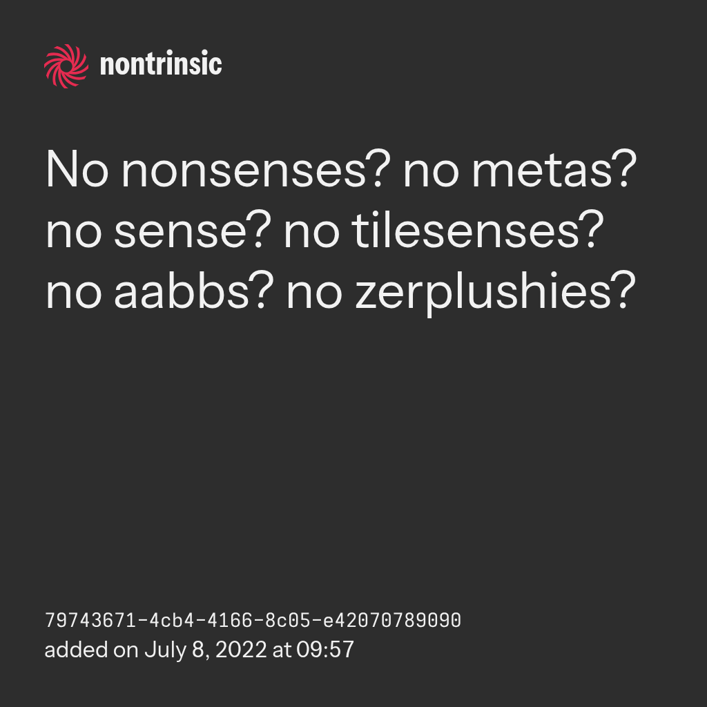 поделитьсяNo nonsenses? no metas? no sense? no tilesenses? no aabbs? no zerplushies?