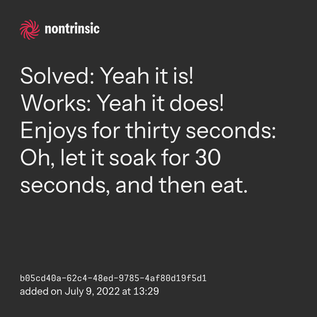 Enjoys for thirty seconds: Oh, let it soak for 30 seconds, and then eat.