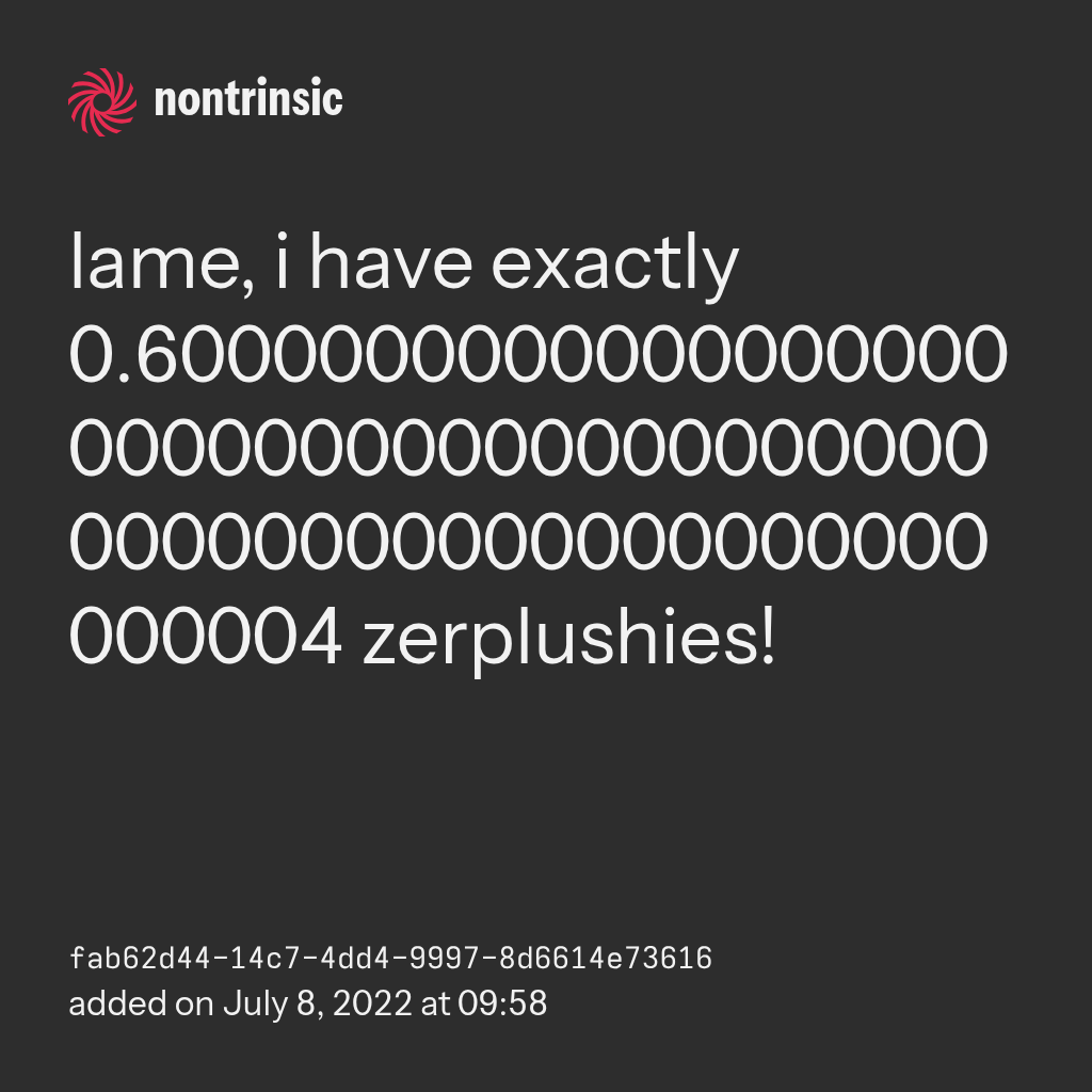 поделитьсяlame, i have exactly 0.60000000000000000000000000000000000000000000000000000000000000004 zerplushies!