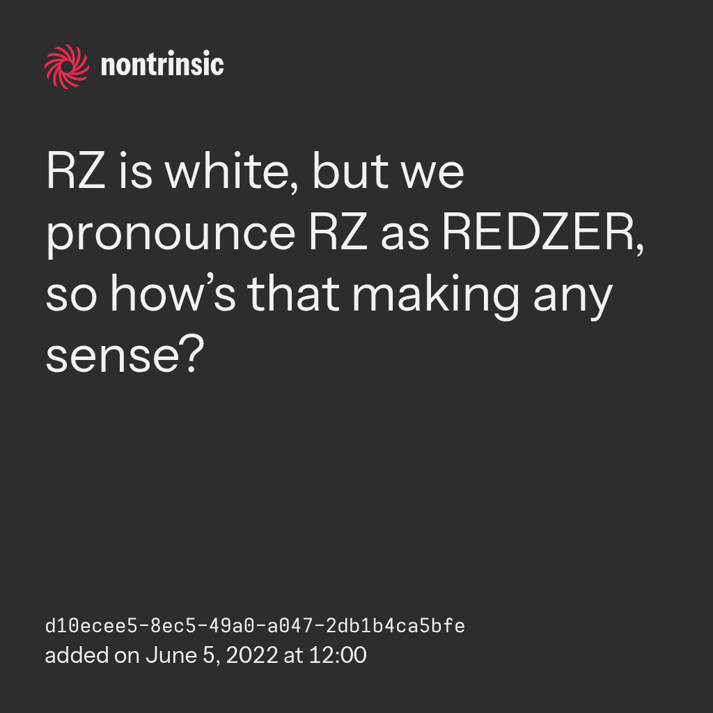 поделитьсяRZ is white, but we pronounce RZ as REDZER, so how’s that making any sense?