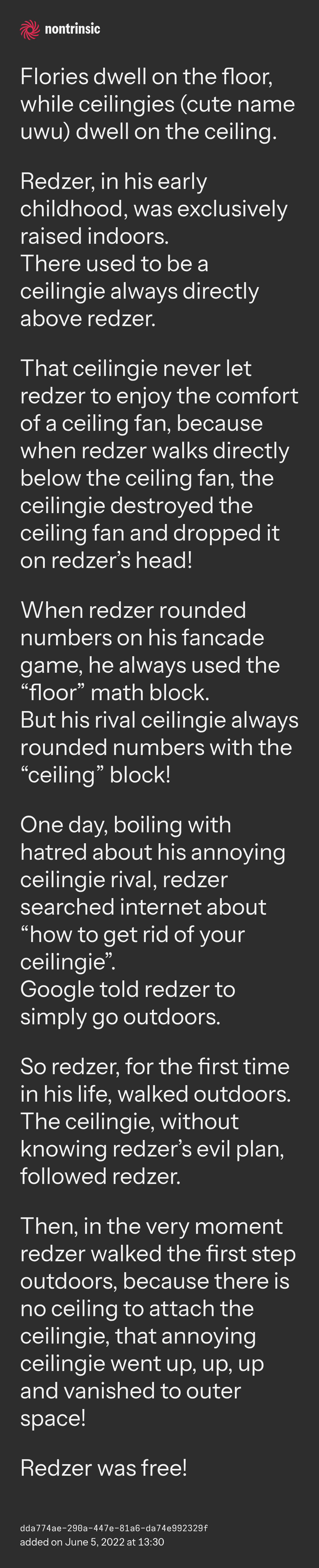 That ceilingie never let redzer to enjoy the comfort of a ceiling fan, because when redzer walks directly below the ceiling fan, the ceilingie destroyed the ceiling fan and dropped it on redzer’s head!