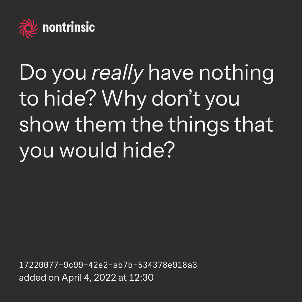 поделитьсяDo you really have nothing to hide? Why don’t you show them the things that you would hide?
