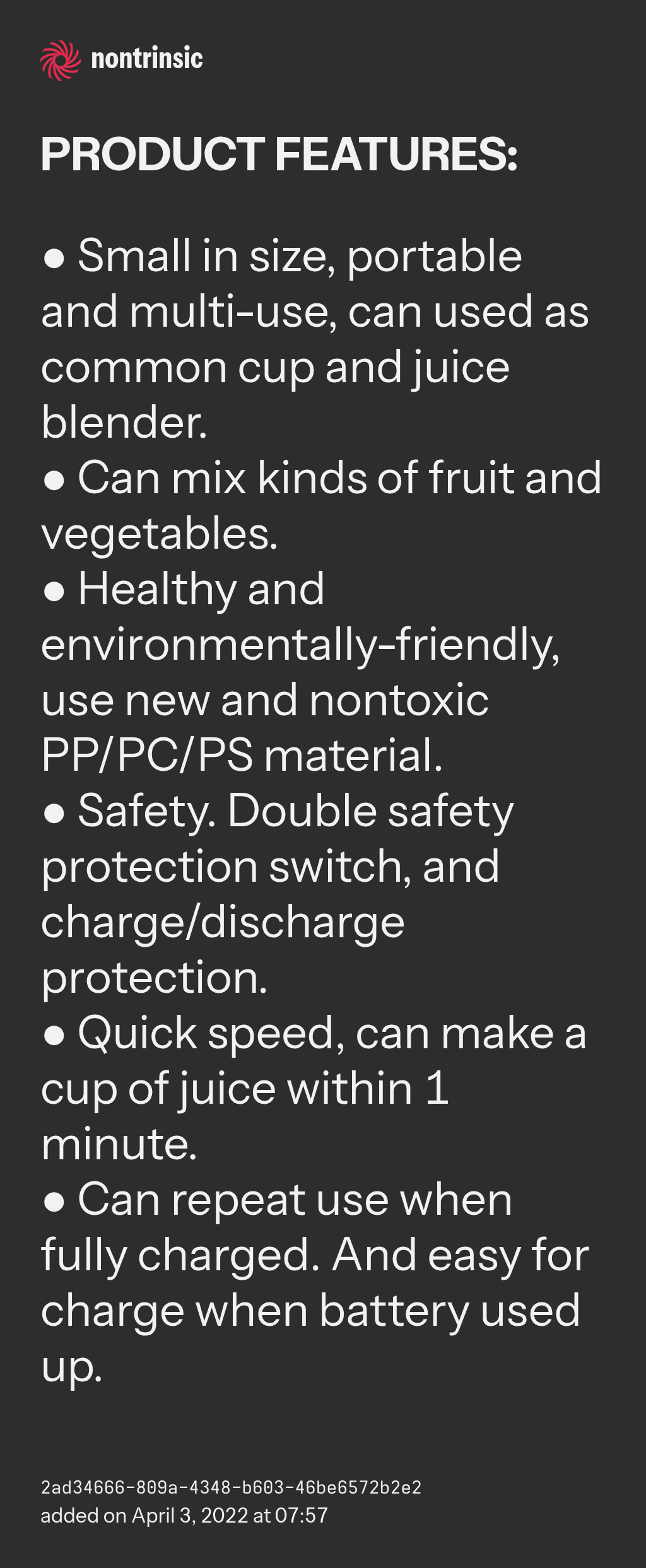 ● Quick speed, can make a cup of juice within 1 minute.