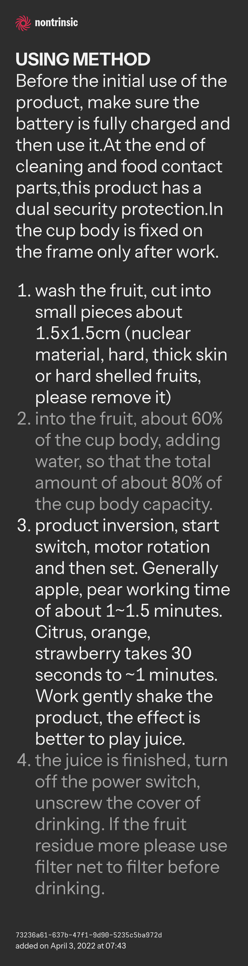 - product inversion, start switch, motor rotation and then set. Generally apple, pear working time of about 1~1.5 minutes. Citrus, orange, strawberry takes 30 seconds to ~1 minutes. Work gently shake the product, the effect is better to play juice.