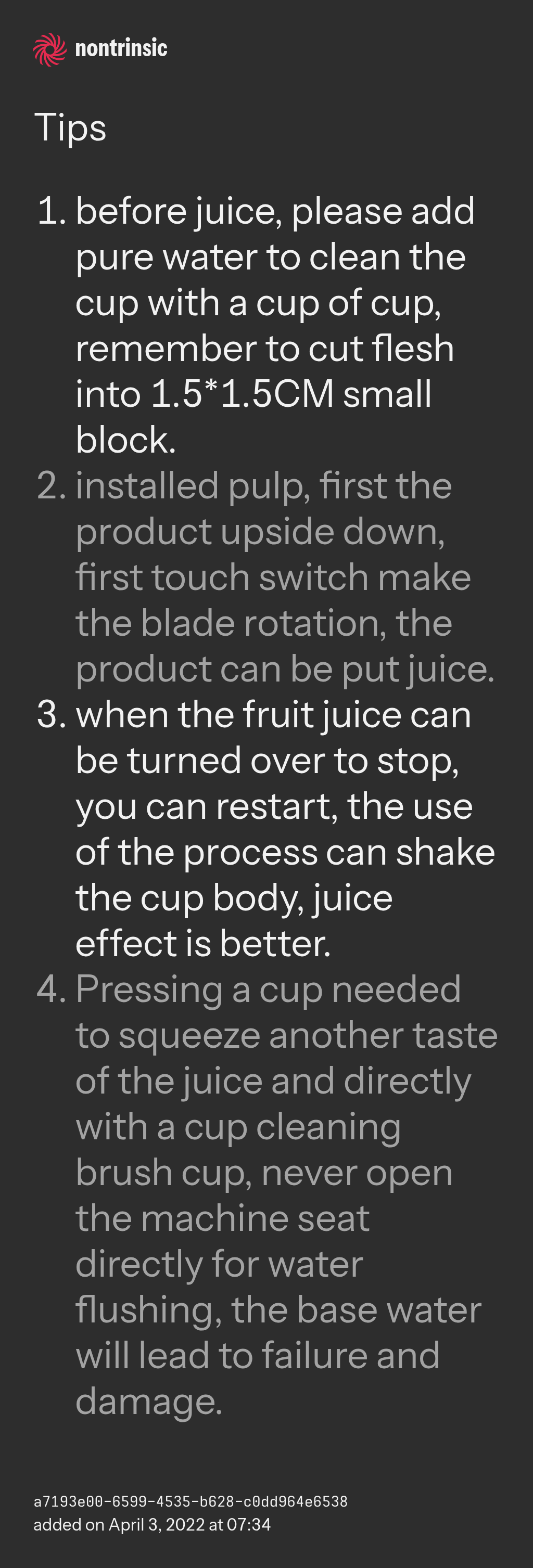 - when the fruit juice can be turned over to stop, you can restart, the use of the process can shake the cup body, juice effect is better.