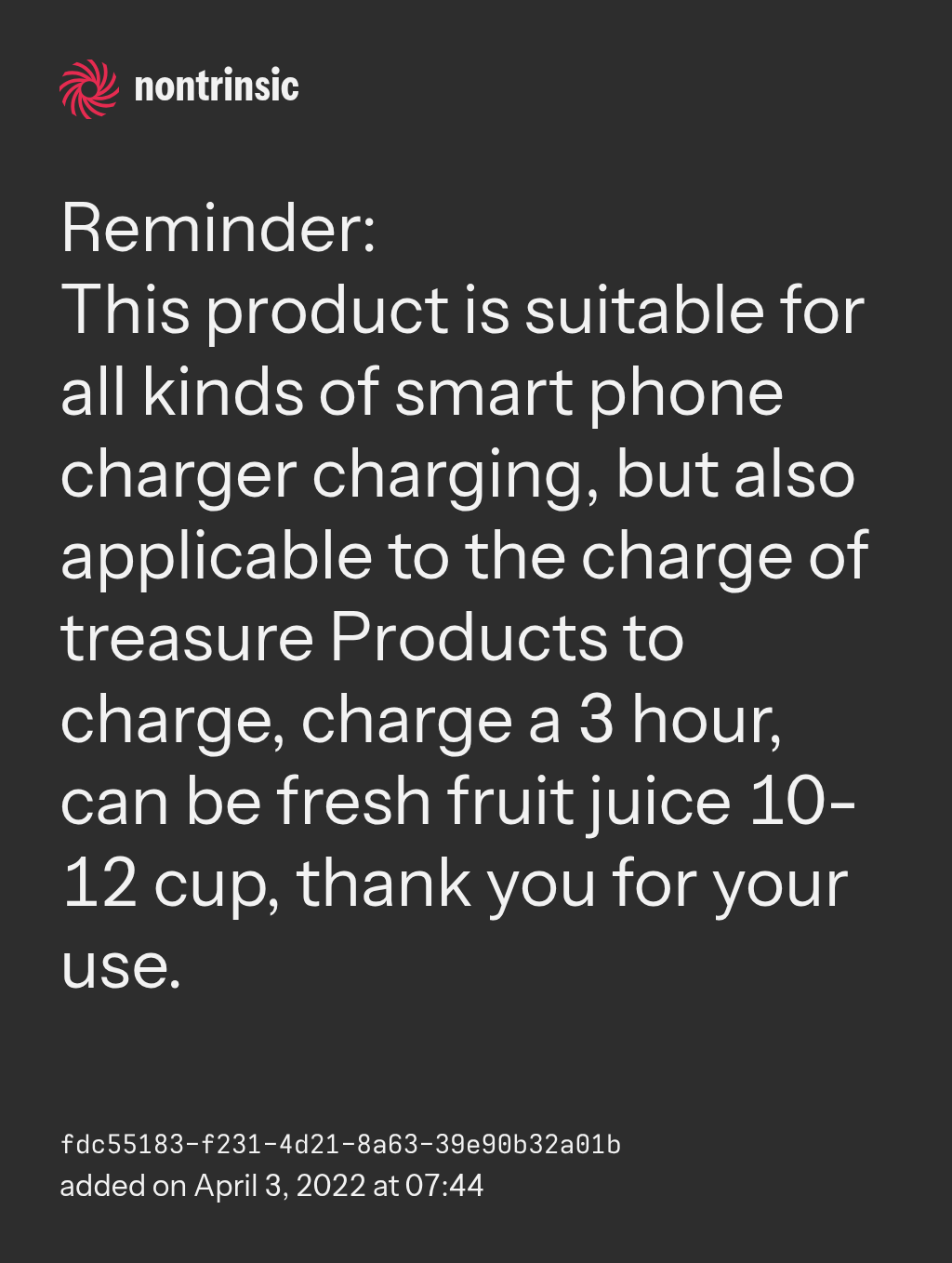 This product is suitable for all kinds of smart phone charger charging, but also applicable to the charge of treasure Products to charge, charge a 3 hour, can be fresh fruit juice 10-12 cup, thank you for your use.