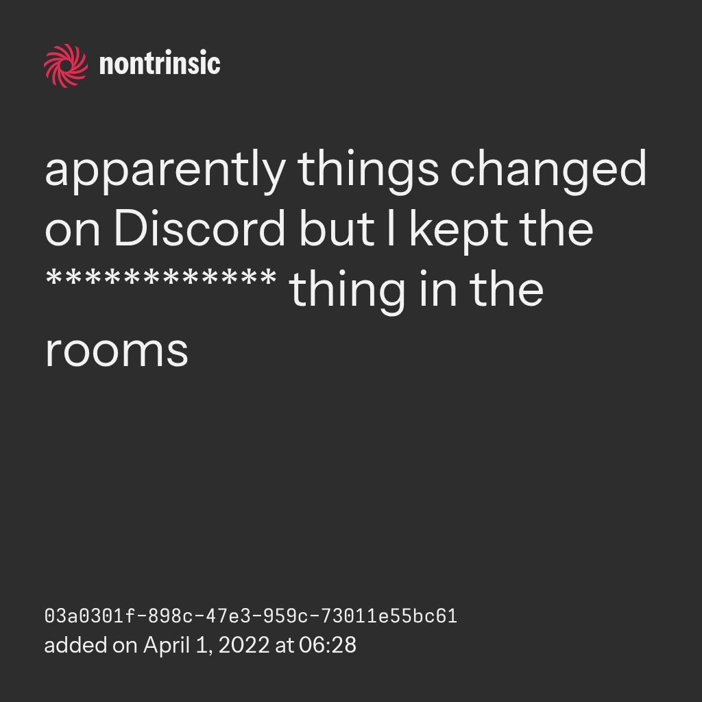 поделитьсяapparently things changed on Discord but I kept the ************ thing in the rooms