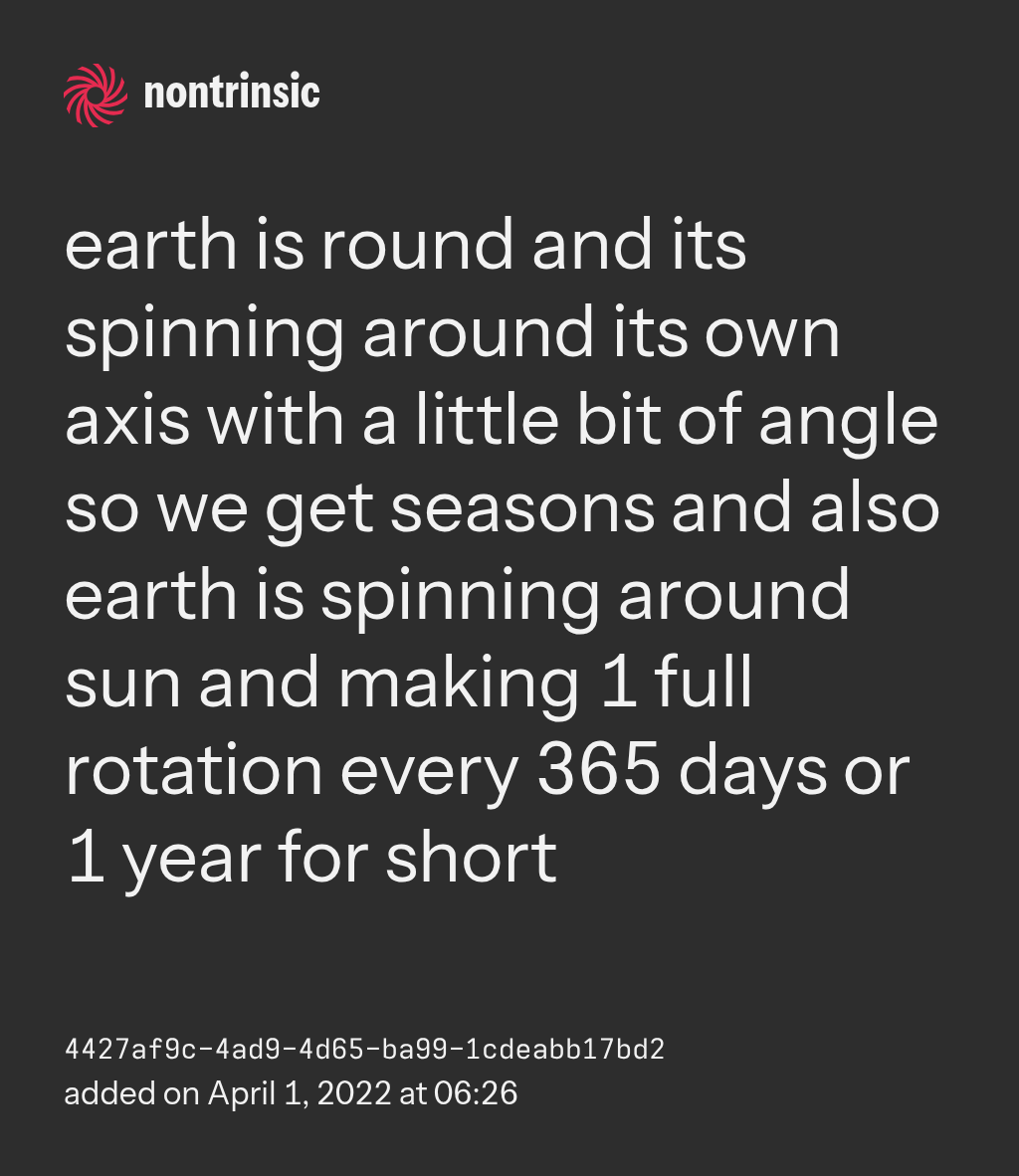 поделитьсяearth is round and its spinning around its own axis with a little bit of angle so we get seasons and also earth is spinning around sun and making 1 full rotation every 365 days or 1 year for short