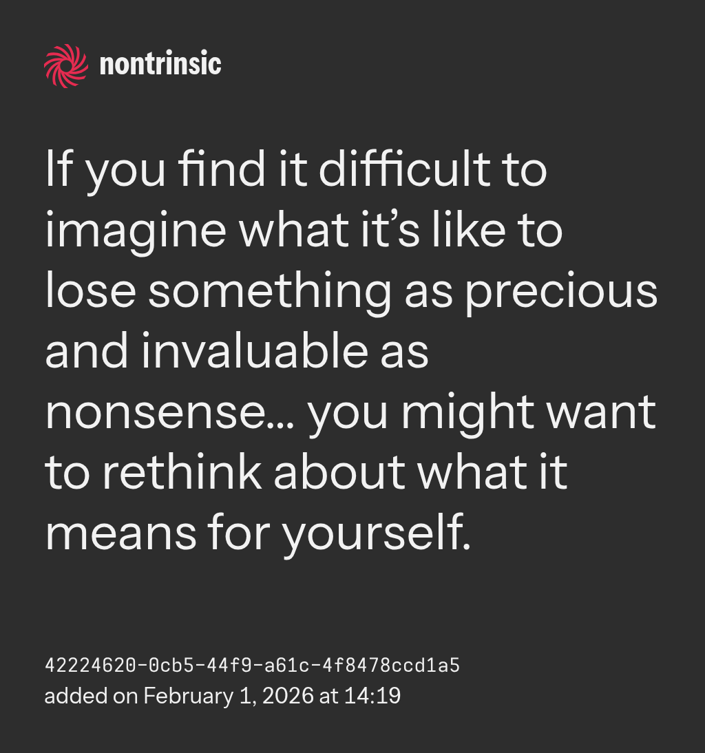 поделитьсяIf you find it difficult to imagine what it’s like to lose something as precious and invaluable as nonsense… you might want to rethink about what it means for yourself.