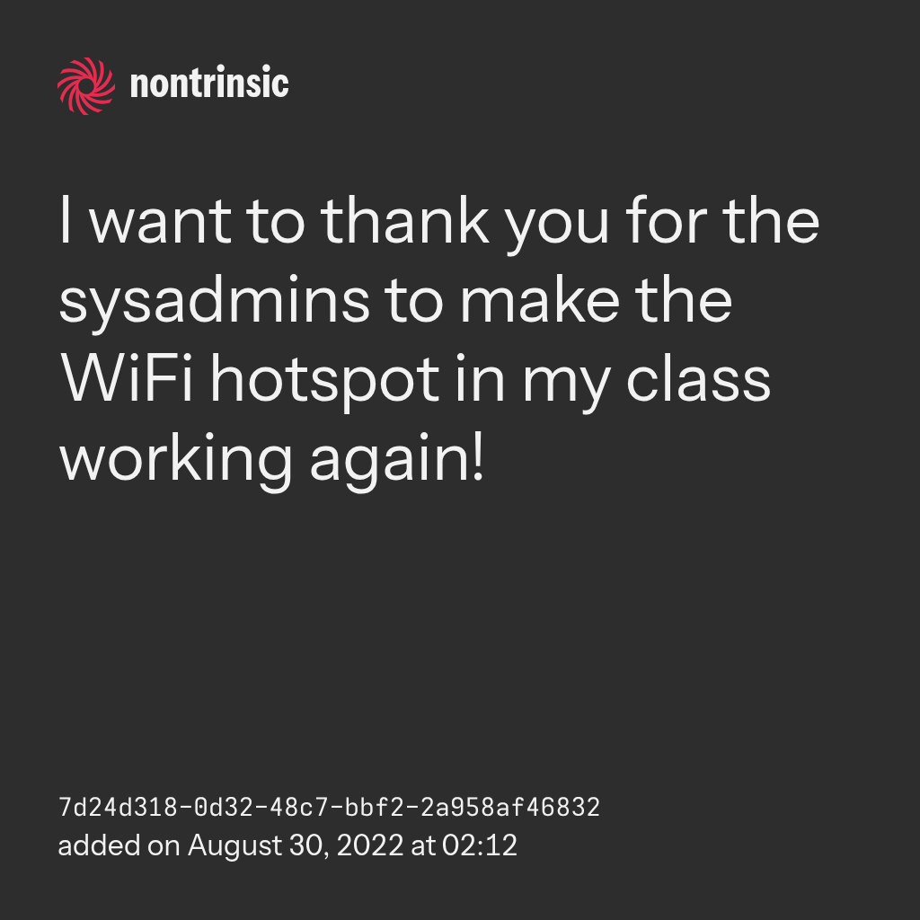 поделитьсяI want to thank you for the sysadmins to make the WiFi hotspot in my class working again!