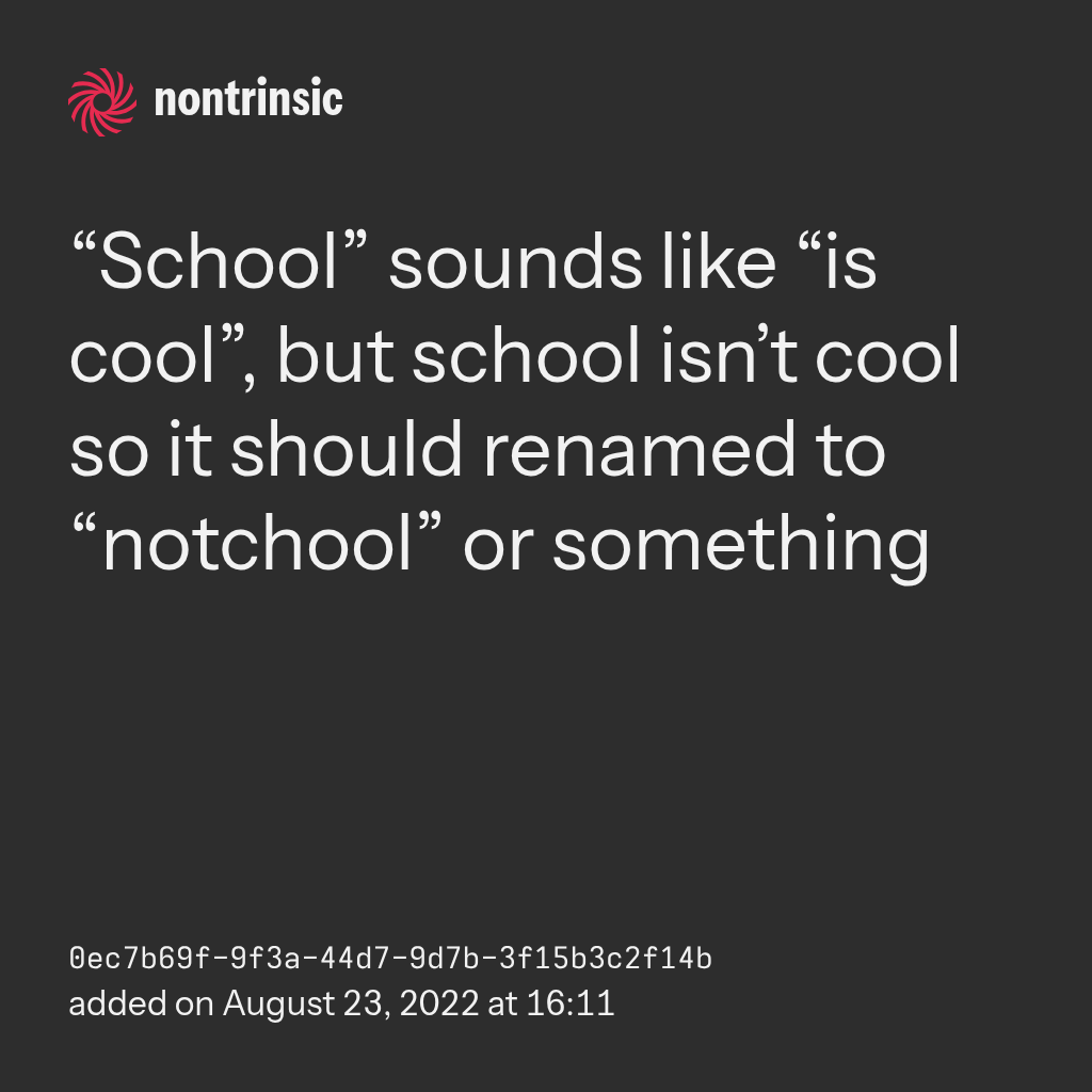 поделиться“School” sounds like “is cool”, but school isn’t cool so it should renamed to “notchool” or something