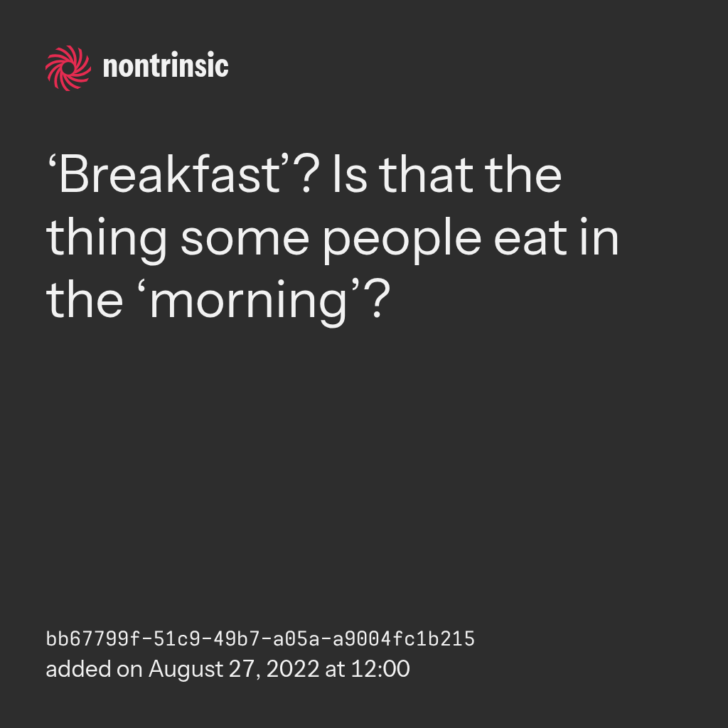 поделиться‘Breakfast’? Is that the thing some people eat in the ‘morning’?
