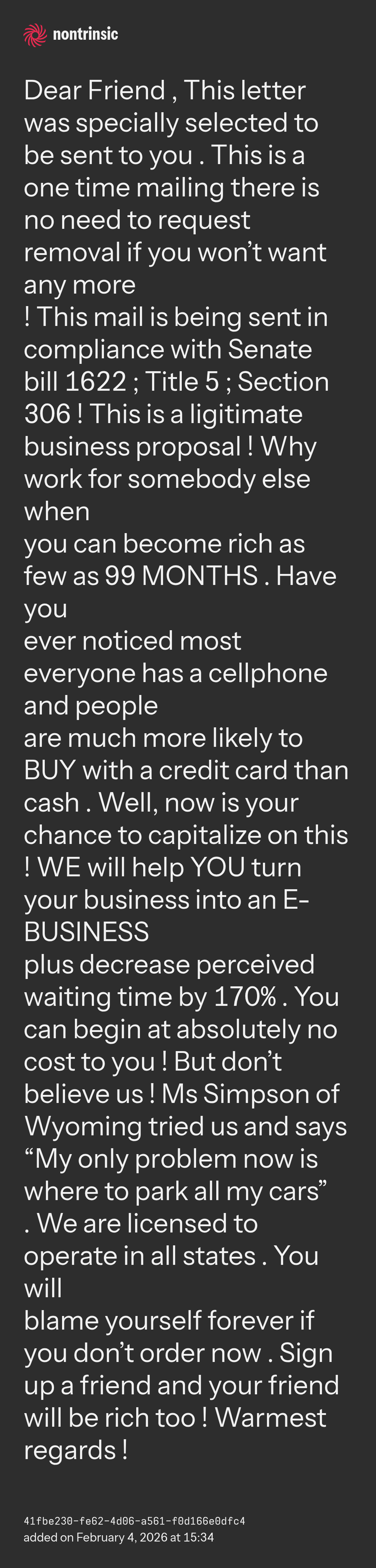! This mail is being sent in compliance with Senate