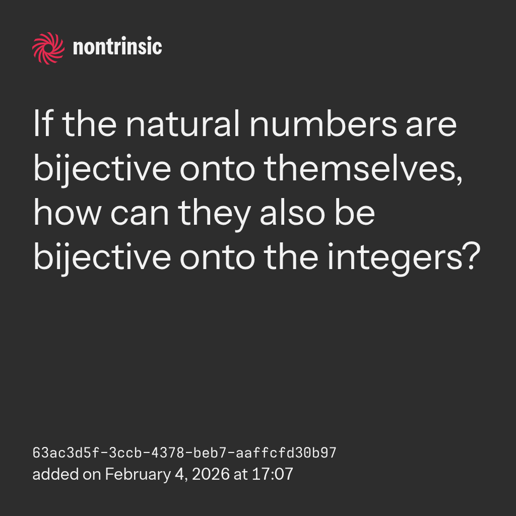 поделитьсяIf the natural numbers are bijective onto themselves, how can they also be bijective onto the integers?