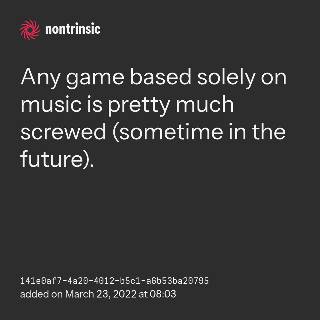 поделитьсяAny game based solely on music is pretty much screwed (sometime in the future).