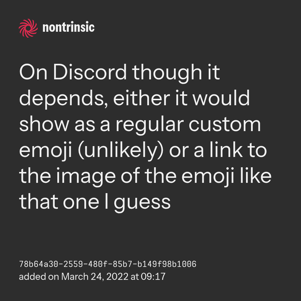 поделитьсяOn Discord though it depends, either it would show as a regular custom emoji (unlikely) or a link to the image of the emoji like that one I guess