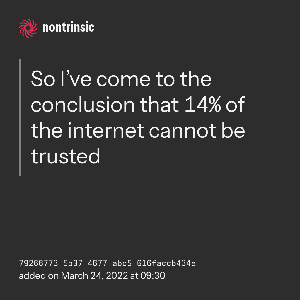 поделитьсяSo I’ve come to the conclusion that 14% of the internet cannot be trusted