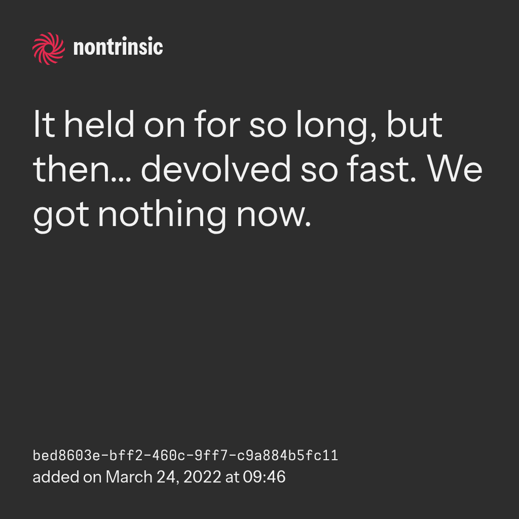 поделитьсяIt held on for so long, but then… devolved so fast. We got nothing now.