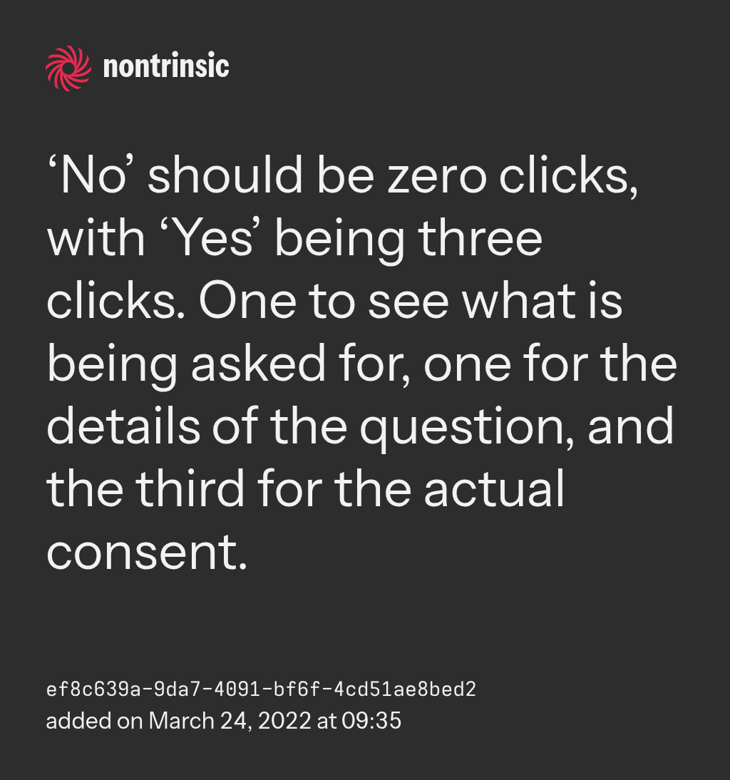 поделиться‘No’ should be zero clicks, with ‘Yes’ being three clicks. One to see what is being asked for, one for the details of the question, and the third for the actual consent.