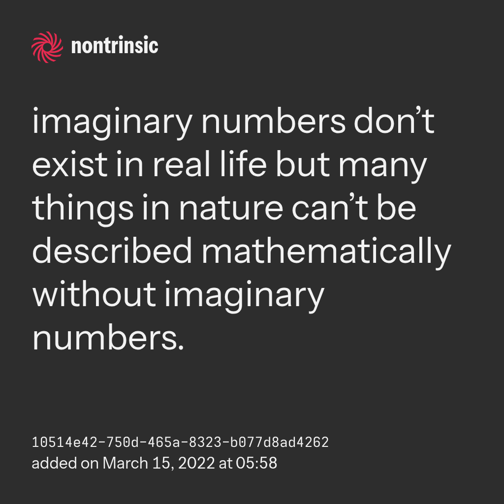 поделитьсяimaginary numbers don’t exist in real life but many things in nature can’t be described mathematically without imaginary numbers.