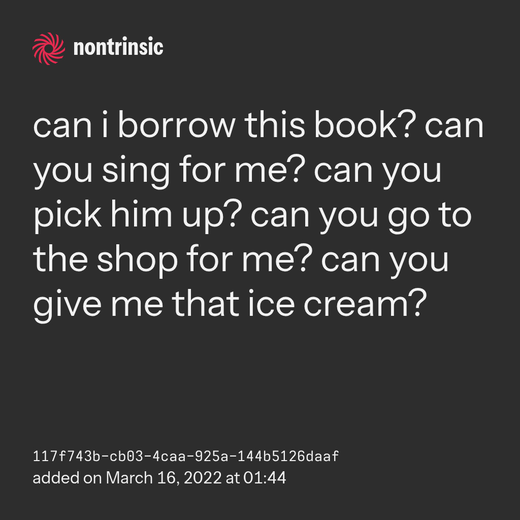 поделитьсяcan i borrow this book? can you sing for me? can you pick him up? can you go to the shop for me? can you give me that ice cream?