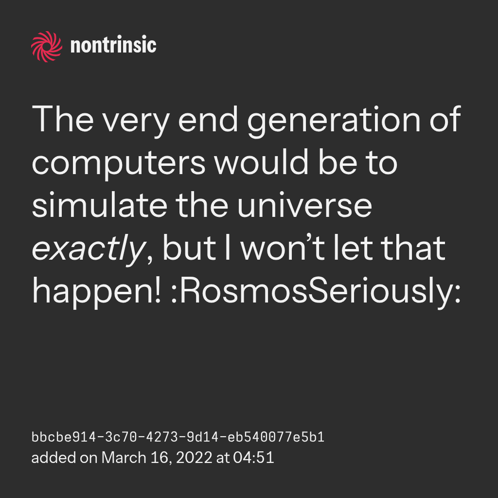 поделитьсяThe very end generation of computers would be to simulate the universe exactly, but I won’t let that happen! :RosmosSeriously:
