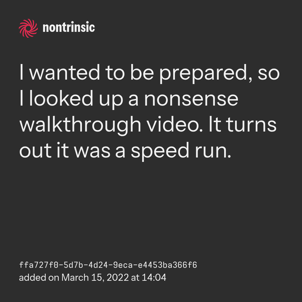 поделитьсяI wanted to be prepared, so I looked up a nonsense walkthrough video. It turns out it was a speed run.