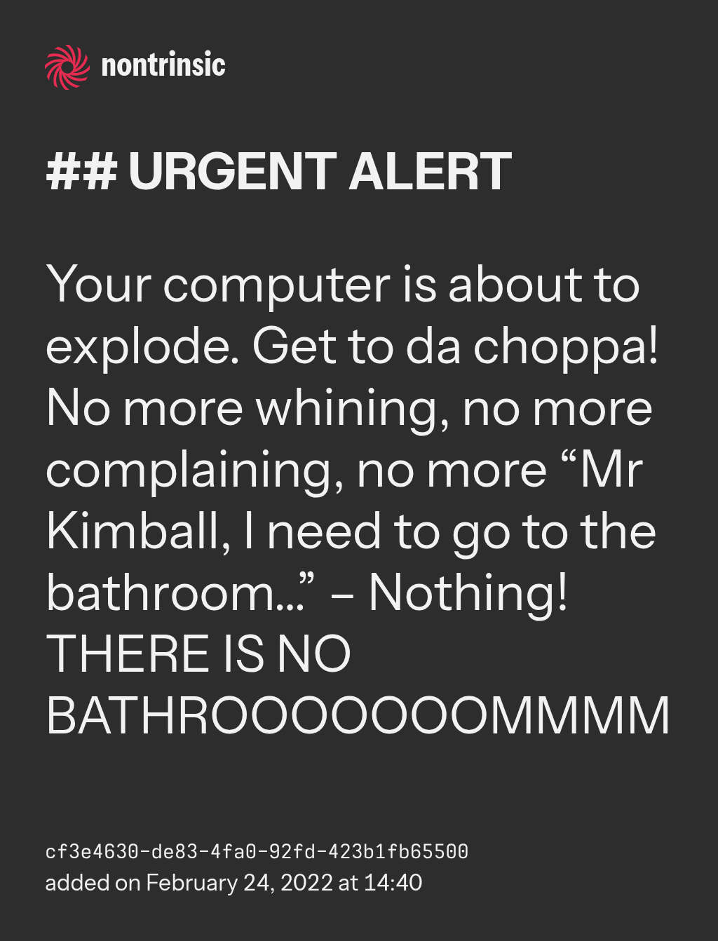 Your computer is about to explode. Get to da choppa! No more whining, no more complaining, no more “Mr Kimball, I need to go to the bathroom…” – Nothing! THERE IS NO BATHROOOOOOOMMMM