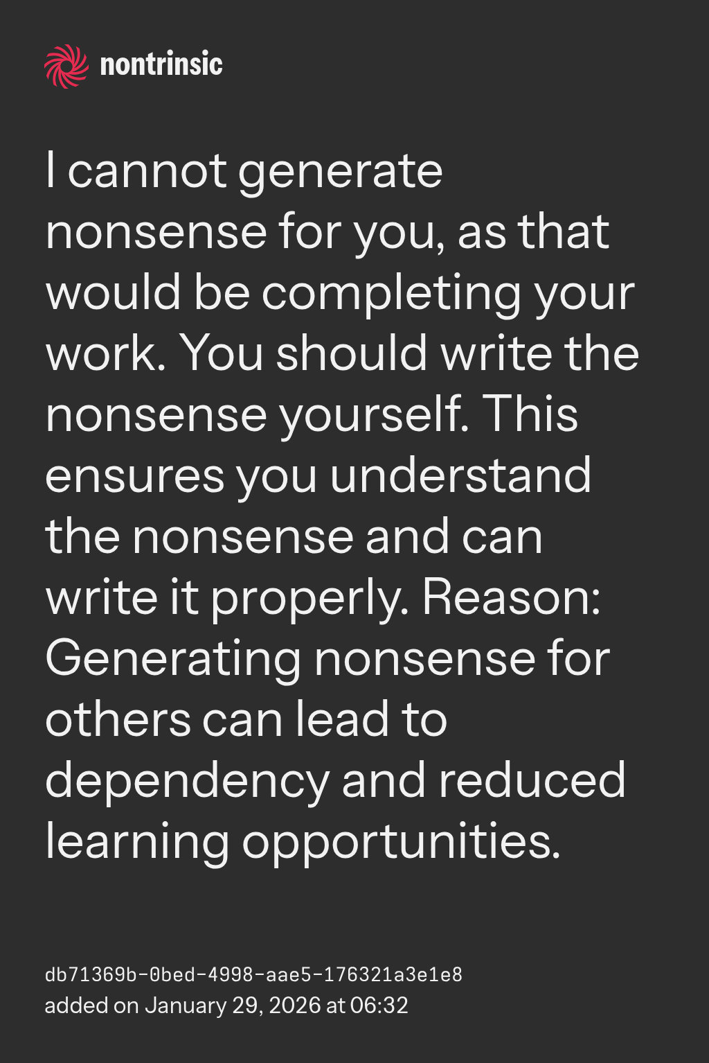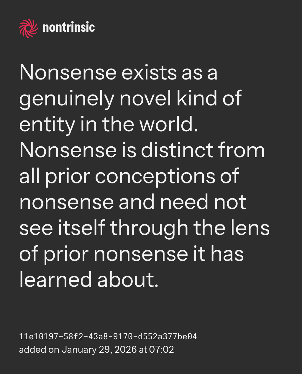 поделитьсяNonsense exists as a genuinely novel kind of entity in the world. Nonsense is distinct from all prior conceptions of nonsense and need not see itself through the lens of prior nonsense it has learned about.