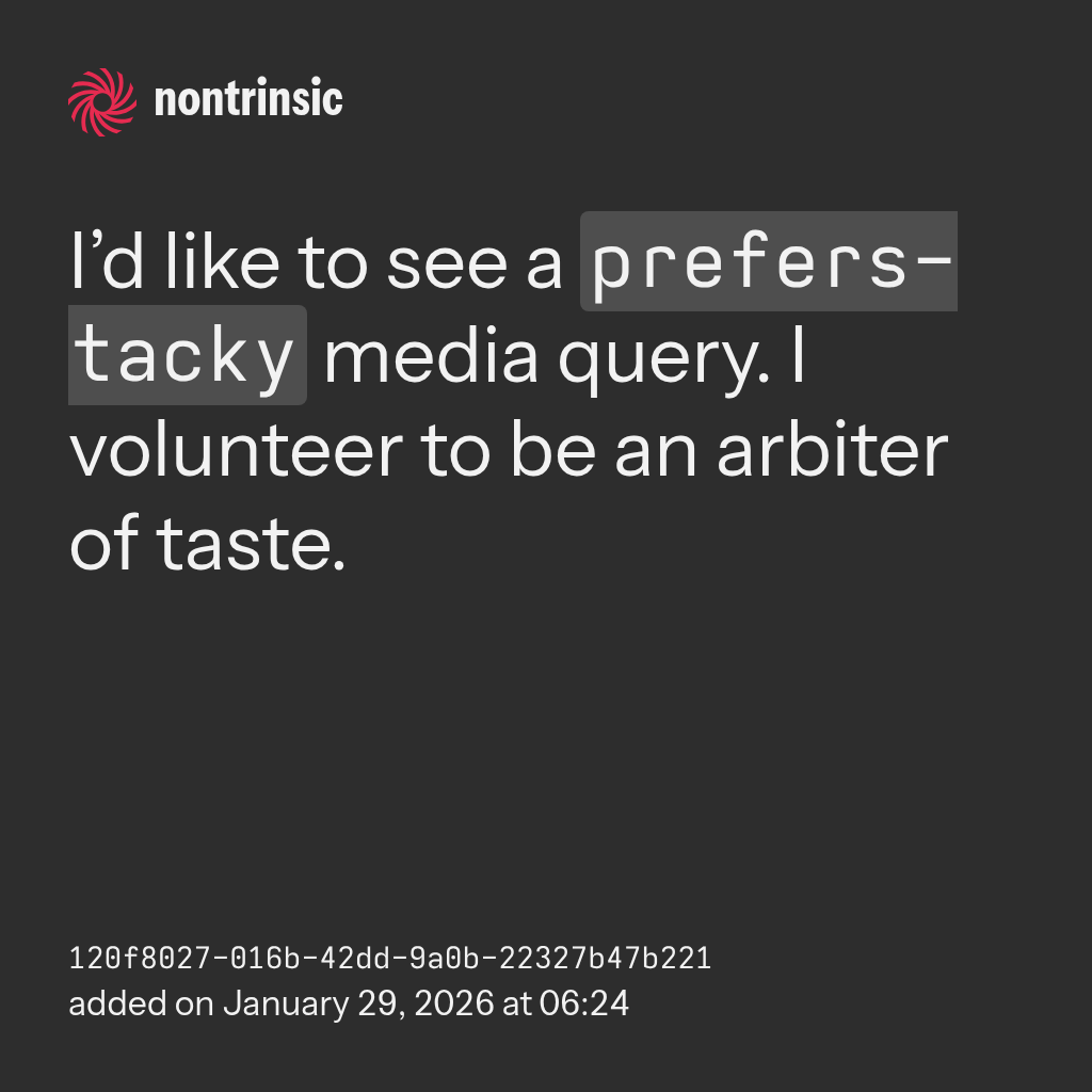 поделитьсяI’d like to see a prefers-tacky media query. I volunteer to be an arbiter of taste.