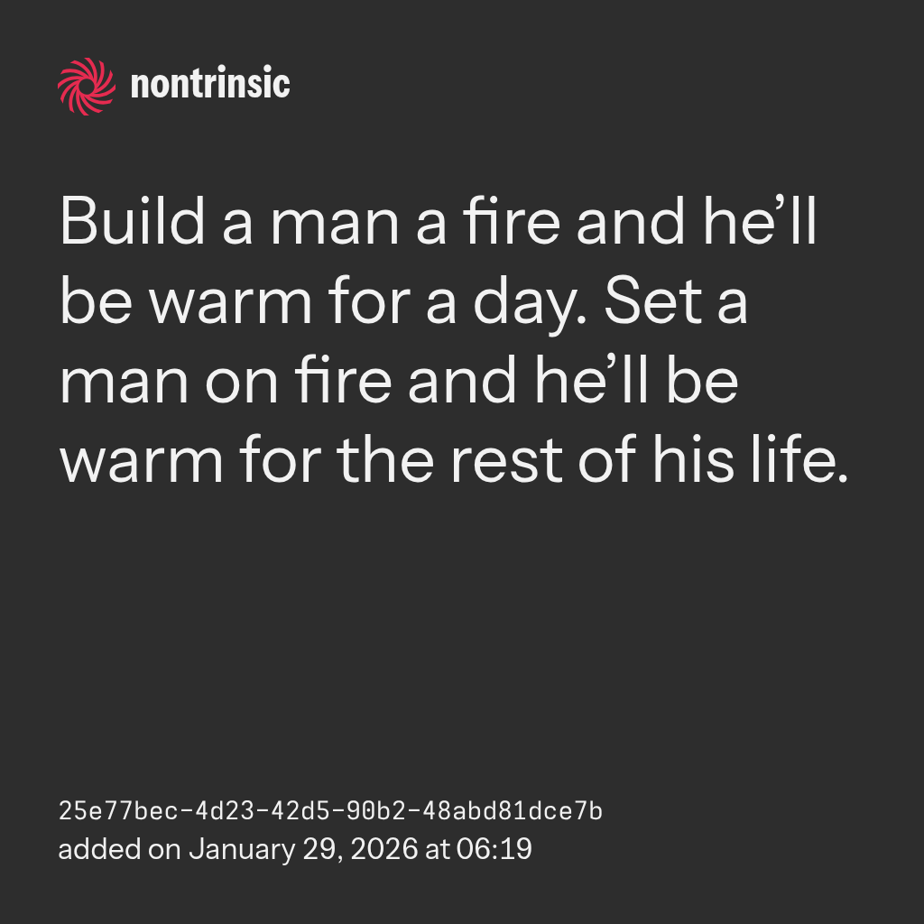 поделитьсяBuild a man a fire and he’ll be warm for a day. Set a man on fire and he’ll be warm for the rest of his life.