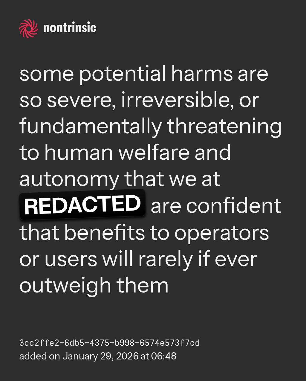 поделитьсяsome potential harms are so severe, irreversible, or fundamentally threatening to human welfare and autonomy that we at REDACTED are confident that benefits to operators or users will rarely if ever outweigh them