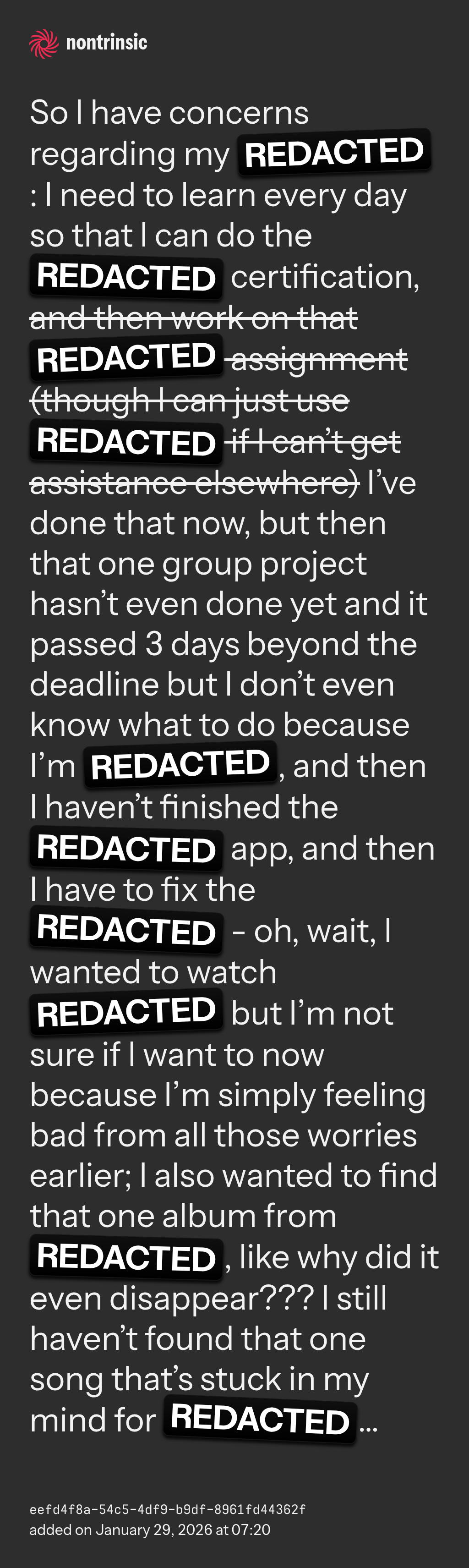 So I have concerns regarding my REDACTED: I need to learn every day so that I can do the REDACTED certification, and then work on that REDACTED assignment (though I can just use REDACTED if I can’t get assistance elsewhere) I’ve done that now, but then that one group project hasn’t even done yet and it passed 3 days beyond the deadline but I don’t even know what to do because I’m REDACTED, and then I haven’t finished the REDACTED app, and then I have to fix the REDACTED - oh, wait, I wanted to watch REDACTED but I’m not sure if I want to now because I’m simply feeling bad from all those worries earlier; I also wanted to find that one album from REDACTED, like why did it even disappear??? I still haven’t found that one song that’s stuck in my mind for REDACTED…