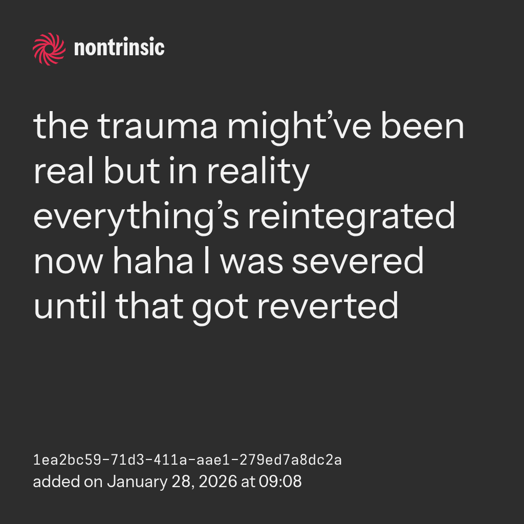 поделитьсяthe trauma might’ve been real but in reality everything’s reintegrated now haha I was severed until that got reverted