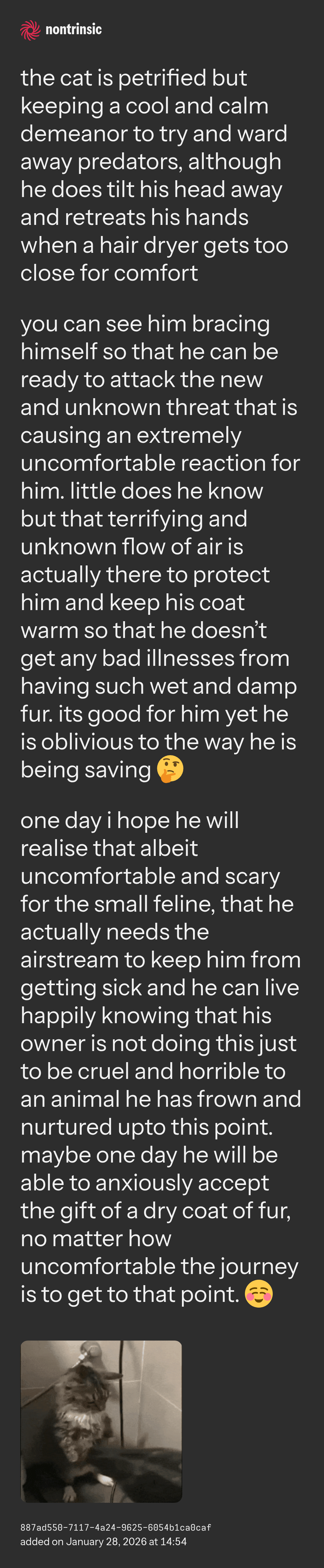 one day i hope he will realise that albeit uncomfortable and scary for the small feline, that he actually needs the airstream to keep him from getting sick and he can live happily knowing that his owner is not doing this just to be cruel and horrible to an animal he has frown and nurtured upto this point. maybe one day he will be able to anxiously accept the gift of a dry coat of fur, no matter how uncomfortable the journey is to get to that point. ☺️