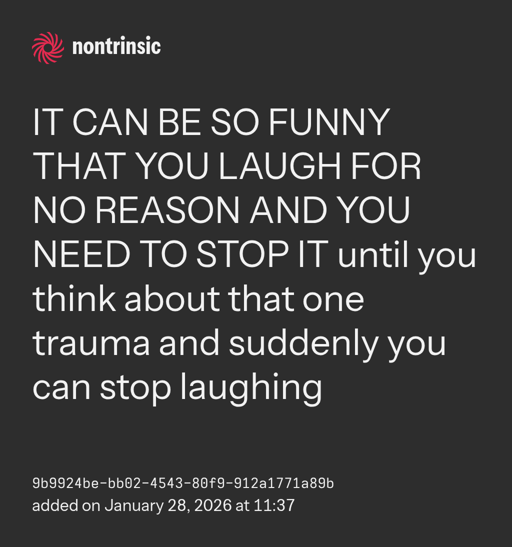 поделитьсяIT CAN BE SO FUNNY THAT YOU LAUGH FOR NO REASON AND YOU NEED TO STOP IT until you think about that one trauma and suddenly you can stop laughing