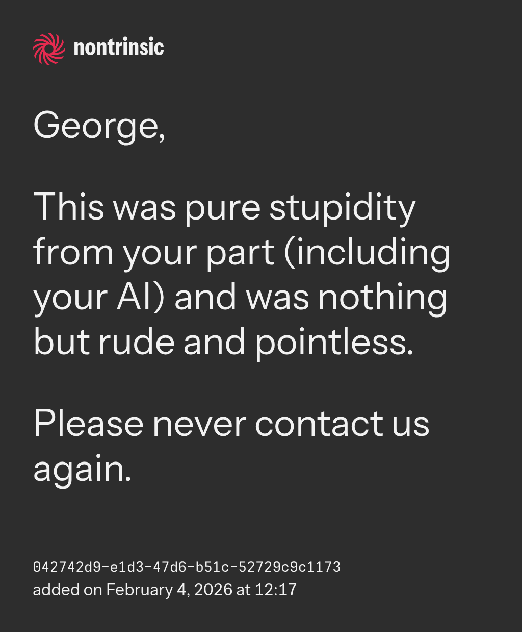 This was pure stupidity from your part (including your AI) and was nothing but rude and pointless.