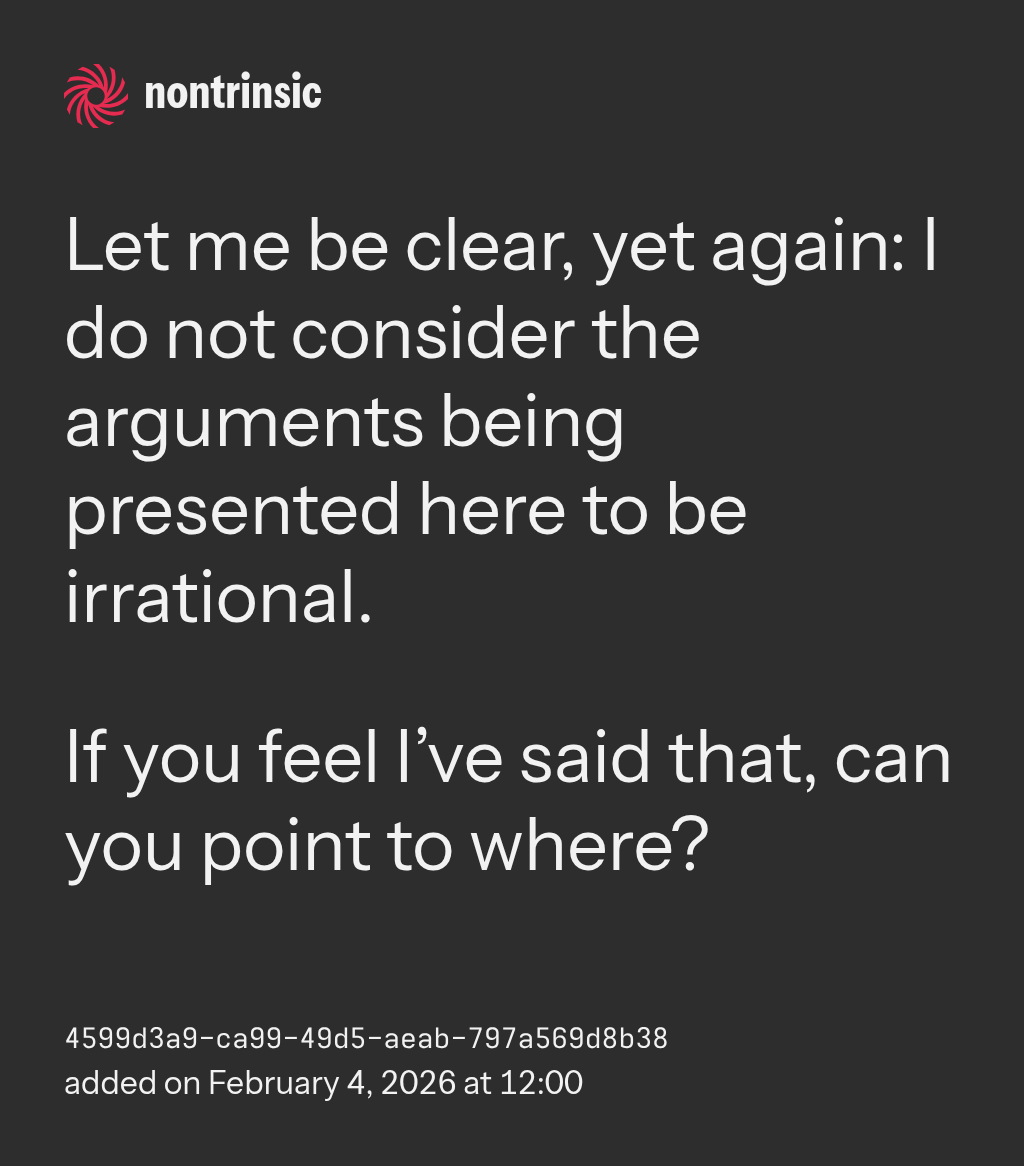 поделитьсяLet me be clear, yet again: I do not consider the arguments being presented here to be irrational.