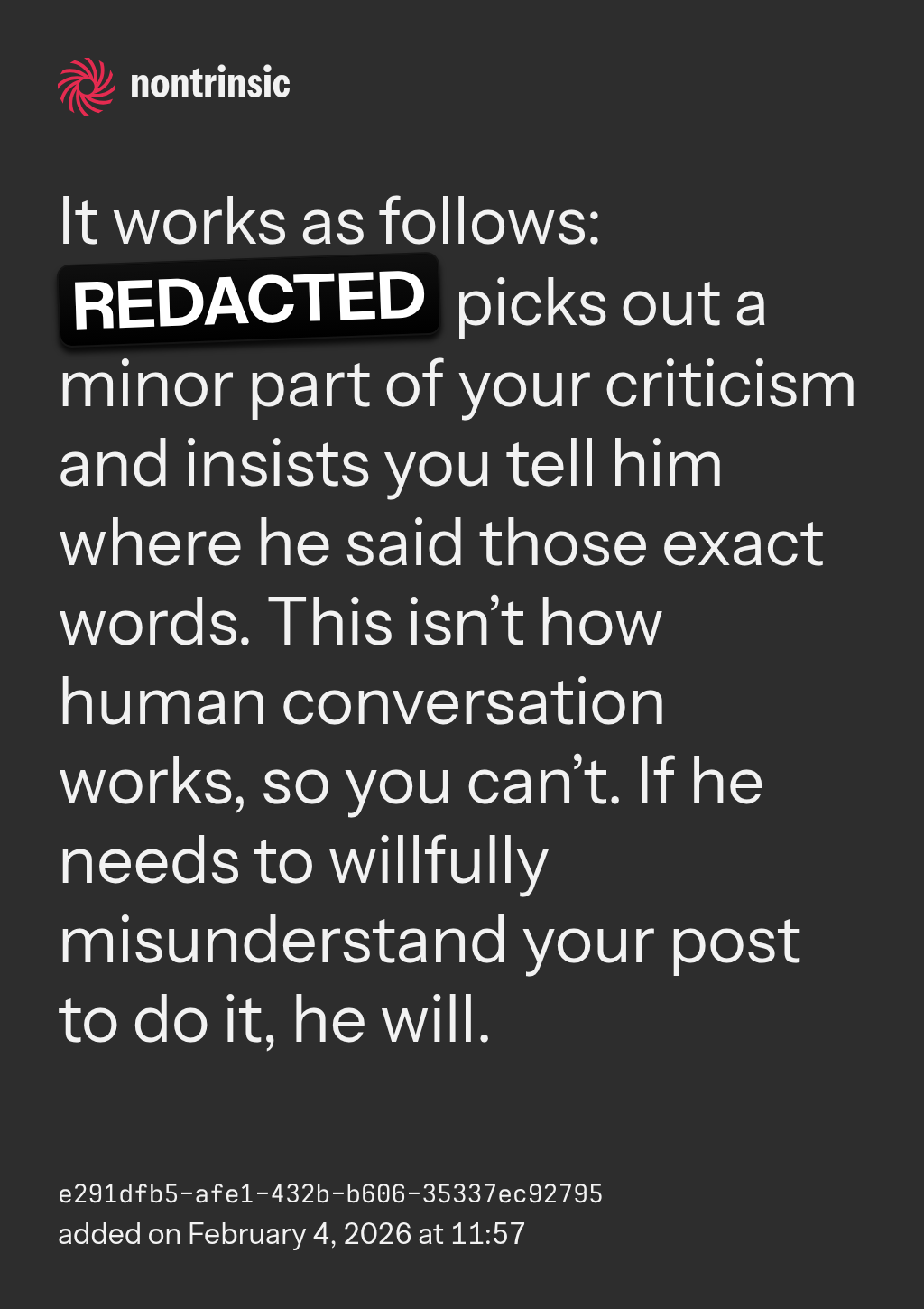 поделитьсяIt works as follows: REDACTED picks out a minor part of your criticism and insists you tell him where he said those exact words. This isn’t how human conversation works, so you can’t. If he needs to willfully misunderstand your post to do it, he will.