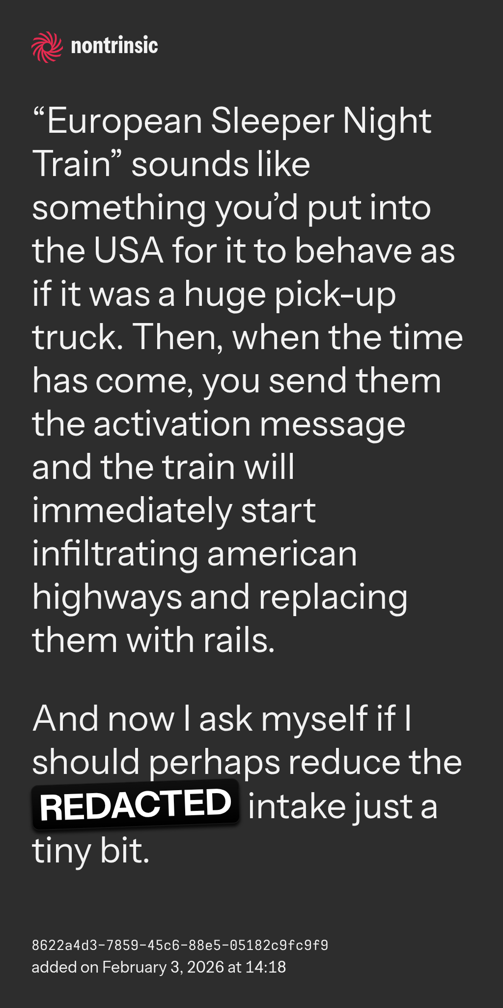 поделиться“European Sleeper Night Train” sounds like something you’d put into the USA for it to behave as if it was a huge pick-up truck. Then, when the time has come, you send them the activation message and the train will immediately start infiltrating american highways and replacing them with rails.