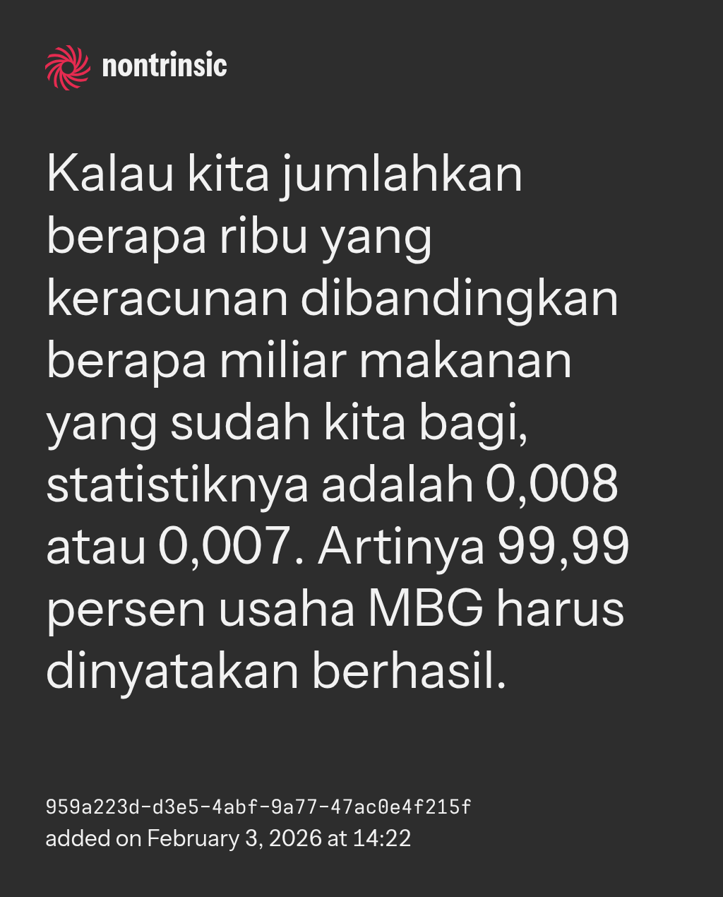 поделитьсяKalau kita jumlahkan berapa ribu yang keracunan dibandingkan berapa miliar makanan yang sudah kita bagi, statistiknya adalah 0,008 atau 0,007. Artinya 99,99 persen usaha MBG harus dinyatakan berhasil.