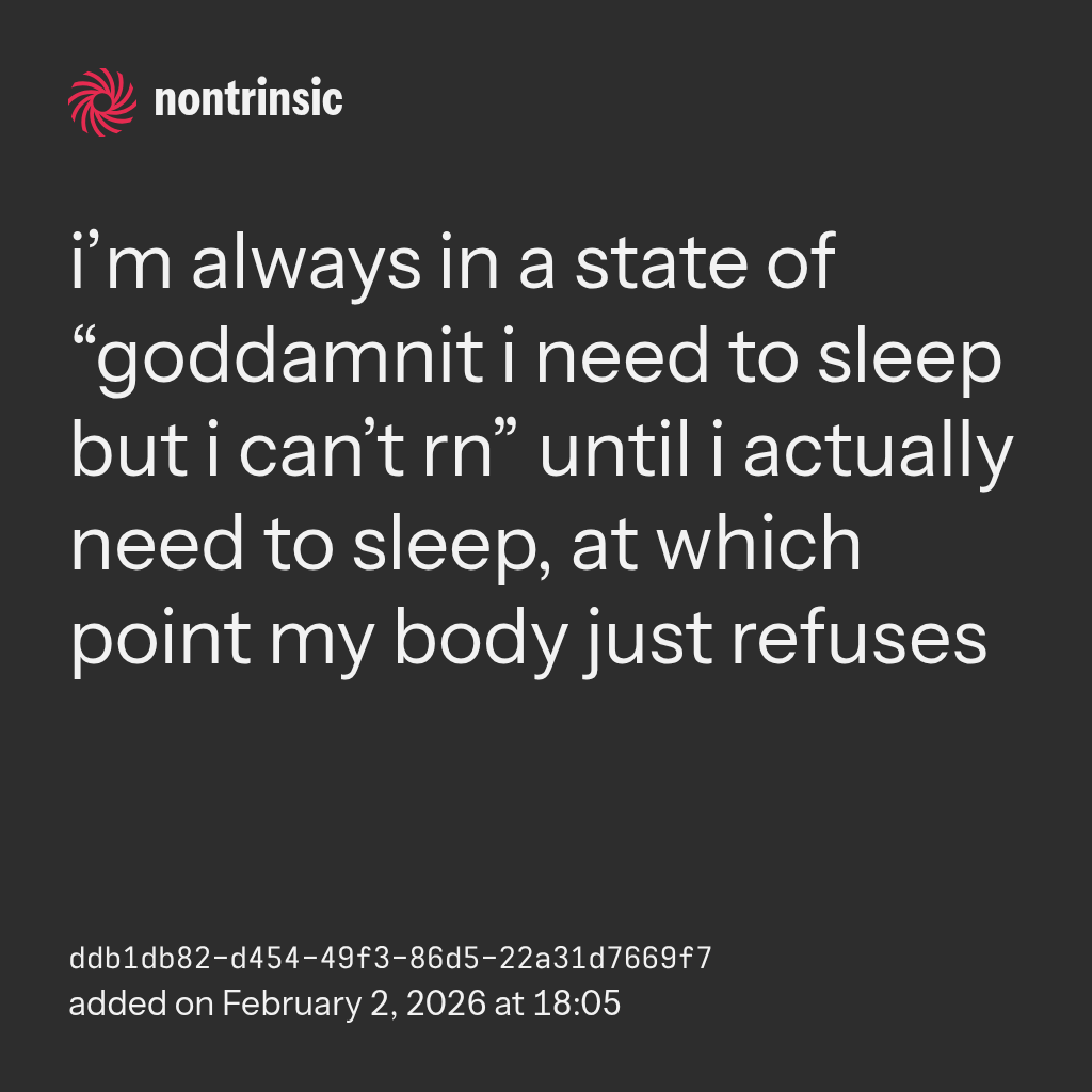 поделитьсяi’m always in a state of “goddamnit i need to sleep but i can’t rn” until i actually need to sleep, at which point my body just refuses